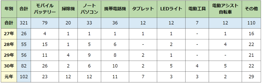 上記のデータからもわかるとおり、幸いにも死者は出ていないようだが平成27年~令和元年の5年間で平均すると1年間で64件、リチウムイオン電池関連の火災が発生している。この数字を多いと捉えるか少ないと捉えるかは人それぞれであるが、年々その数字は確実に伸びている。また、”製品用途別”に見ると次のとおりとなる。