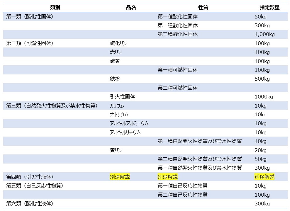 危険物の基本的な位置づけと規制がわかったところで一覧表から危険物の全体像を見ていきたい。危険物の一覧表は消防法別表第一、危険物の指定数量の一覧は危険物規制に関する政令別表第三にまとめられている。指定数量を簡易的に以下の表にまとめたので参考にされたい。