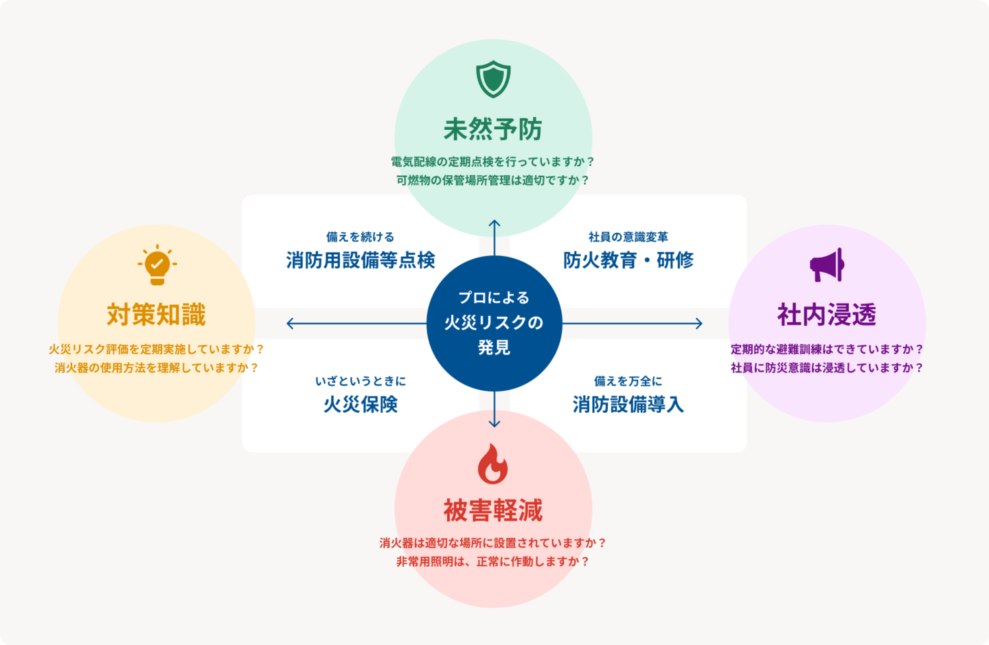 課題を早期に発見し、適切な対策を講じることで火災のリスクを低減させます。万が一火災が発生した場合でも、被害を最小限に抑えるとともに、企業の重要な財産を守ります。