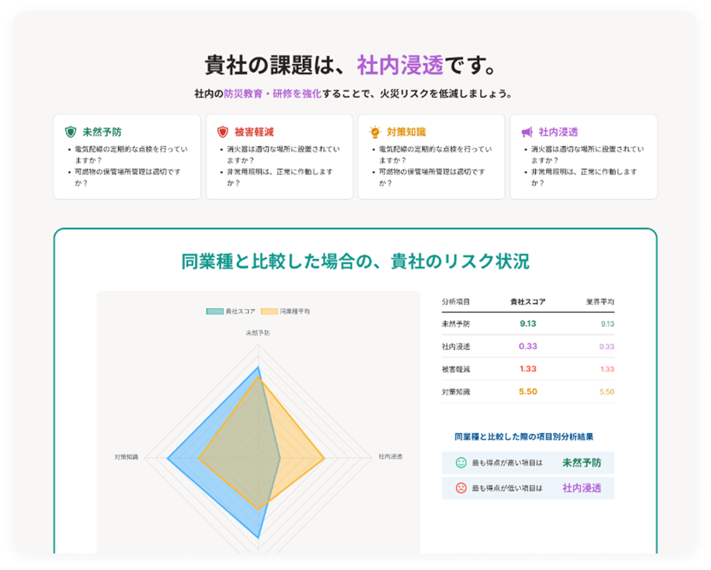 - 1700件以上の診断実績で蓄積した重要なデータにより、業界平均との比較した結果を実施。