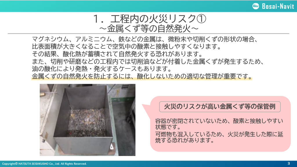 本資料では、金属くずの自然発火や電工ドラムの過熱、集塵機火災など、現場担当者が知っておくべき日常に潜む「見落としがちな火種」を徹底解説しています。