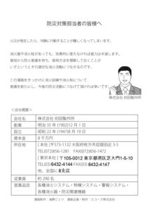 火災を未然に防ぐのであれば、出火リスクの洗い出しをおこなう「火災発生リスク診断サービス」 がお勧めである。一方、出火後の被害を少なくするのであれば初期消火体制の確立(維持管理・訓練)が必須である。 そして、万が一罹災してしまったときの経済的損失に備えるのが火災保険となる。