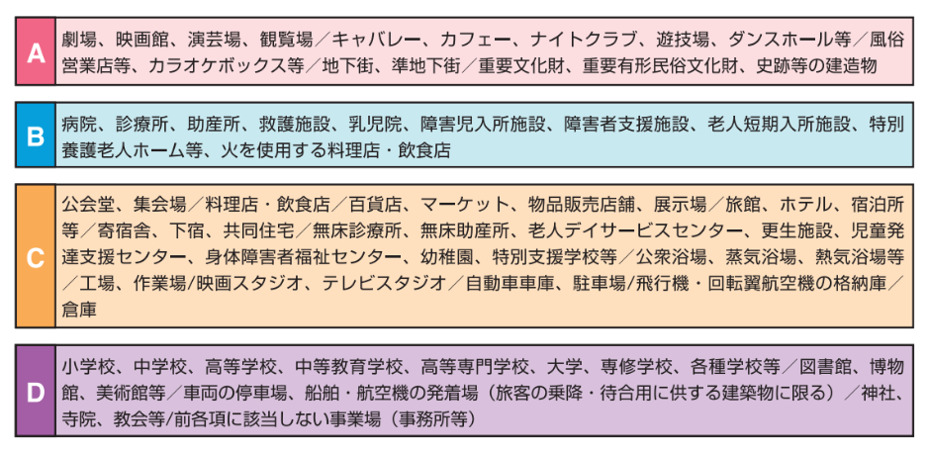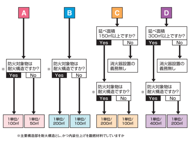 ① 防火対象物に消火器を設置する時は、下表のA~Dのどの防火対象物に該当するか確認しましょう。