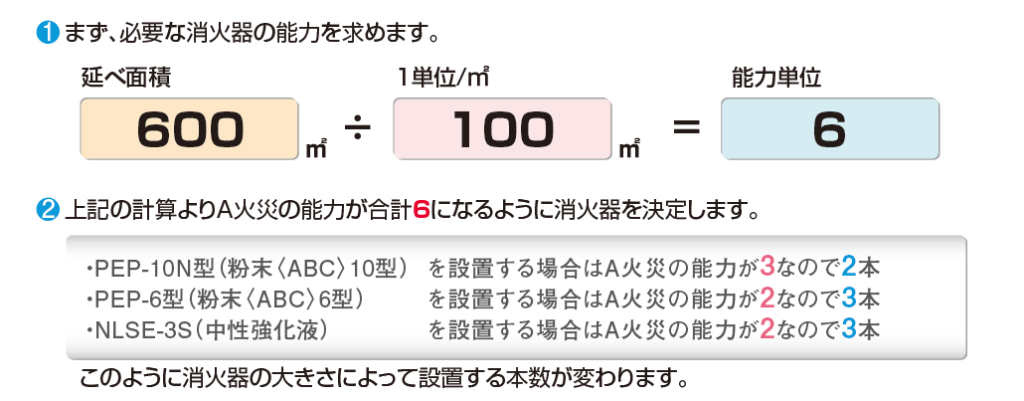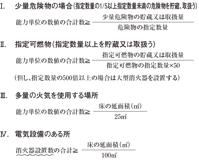 ③第4類の危険物を貯蔵又は取り扱うものとして消火器を設けるときは、B火災に対する能力単位で計算します。その他の場合は、A火災に対する能力単位で計算します。