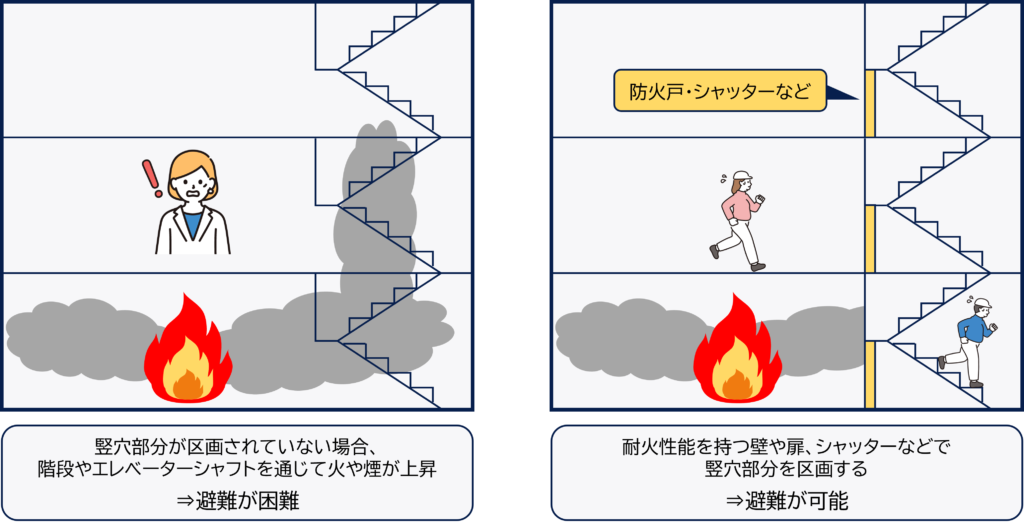 竪穴区画の設置は、特に高層建築物や地下施設において重要です。これらの建物では、火災が発生した場合に煙が上昇しやすく、迅速な避難が求められるため、竪穴区画の適切な設置が不可欠です。
