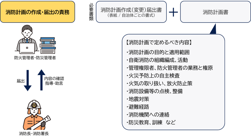 防火・防災管理者は、管理権原者の指示を受けて、防火対象物の使用開始前に消防計画を作成し、その計画を所轄の消防長または消防署長に届け出る義務があります。この届出により、消防機関は建物や施設の防火対策が適切に整備されているかを確認し、必要に応じて指導や助言を行います。